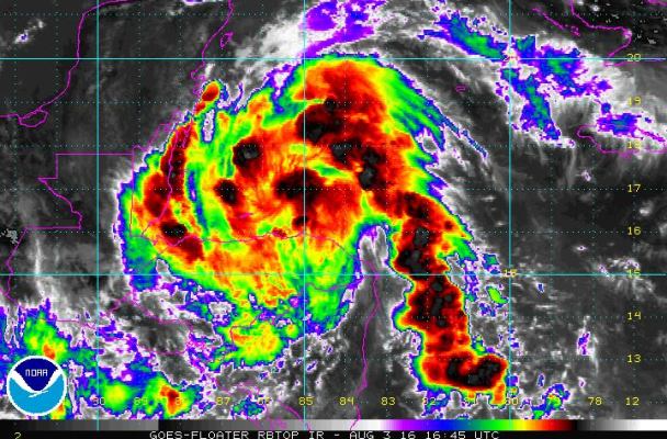 A las 08:00 horas locales (12:00 GMT) el centro de la tormenta se ubicó a 195 kilómetros al este de la Isla Roatán, en Honduras, a 425 kilómetros al sureste de la ciudad de Belice, indicó la dependencia estadunidense a través de un comunicado.