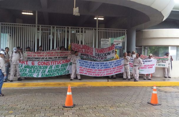 Se manifiestan petroleros sin empleo ante el edificio inteligente de PEMEX