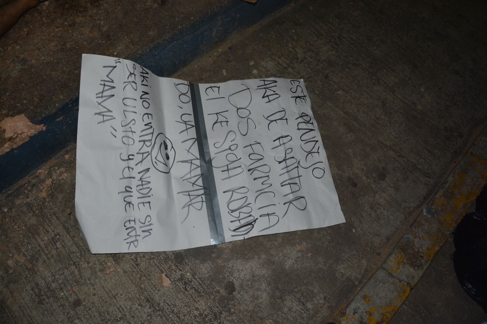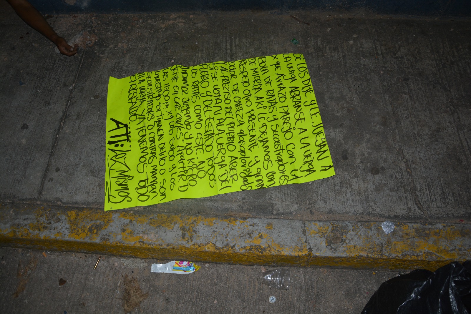 A decir lo relatado por una cartulina que le fue dejada a un costado del cuerpo sin vida, decía: “Se los dije y le juegan a la verga abranse a la verga x que abrazo parejo con la bola de ratas y secuestradores de mierda aki le dejamos con respeto otro presente, y gran dolor de cabeza a las autoridades…(SIC)”.