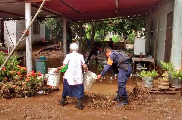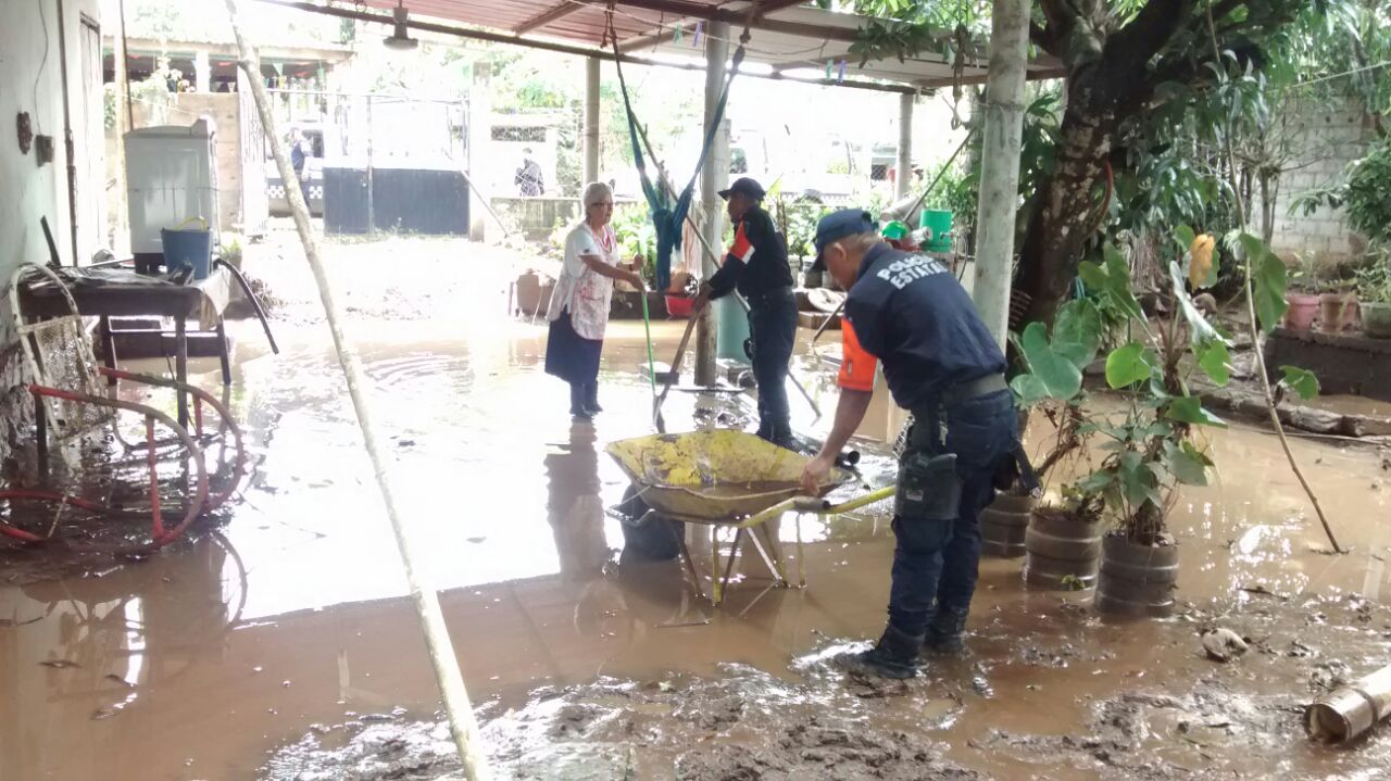 En la comunidad El Sauzal, perteneciente a Hueyapan de Ocampo, la Policía Estatal lleva a cabo, junto con pobladores, limpieza en diferentes domicilios y la escuela principal, afectaciones que dejó el paso del disturbio climatológico.