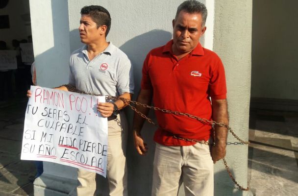 La señora Iris del Carmen Arroniz Rodríguez, narró que fue cajera durante 20 años y ahora el grupo MAS la quería liquidar con menos del 30 por ciento de lo que en realidad le toca por ley, situación por la cual decidió permanecer amarrada con cadenas al pilar del ayuntamiento en protesta por esta situación.