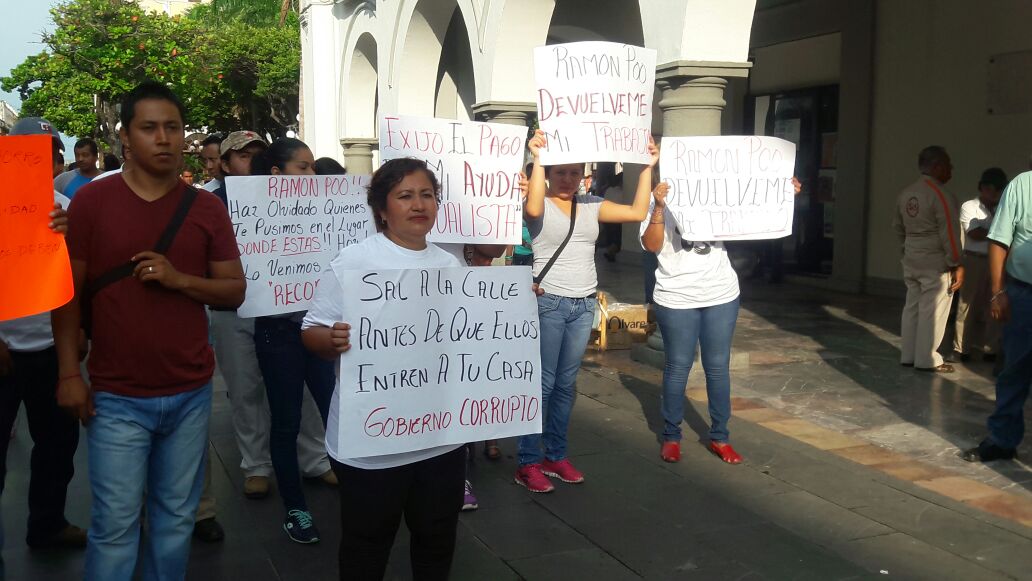 Las decenas de ex empleados llegaron al izado de bandera donde no se presentaron las autoridades municipales, solamente fue exhibida la bandera por un empleado del ayuntamiento, posterior a esto los manifestantes con lonas, cartulinas y cadenas se plantaron en los bajos del edificio histórico.