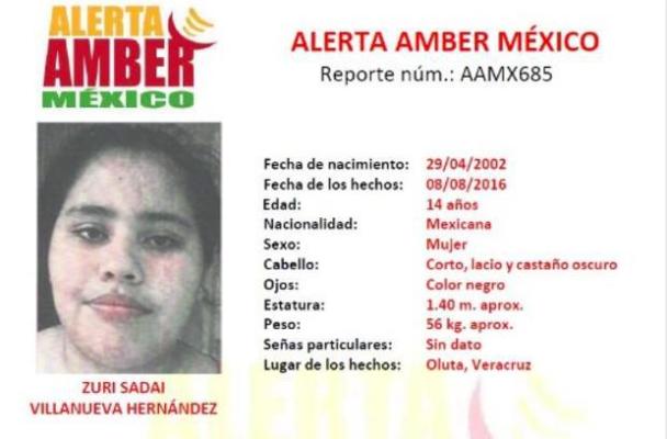 Ciudad Victoria, Tmps.– La delegación estatal de la Procuraduría General de la República (PGR) activó la alerta Amber en Tamaulipas, tras la desaparición de la menor Zuri Sadai Villanueva Hernández, de 14 años de edad, en el estado de Veracruz.
