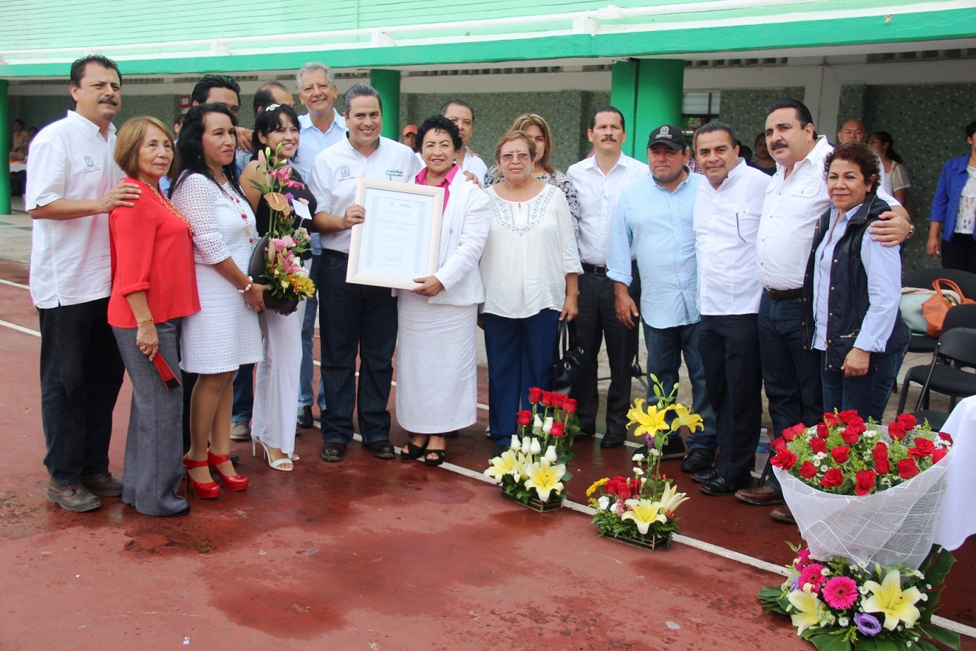 En el evento realizado en la explanada de la escuela “Artículo 123”, la primera autoridad hizo entrega de un merecido reconocimiento a la profesora Sara Guillermina por su profesionalismo en la educación y el beneficio de la niñez.