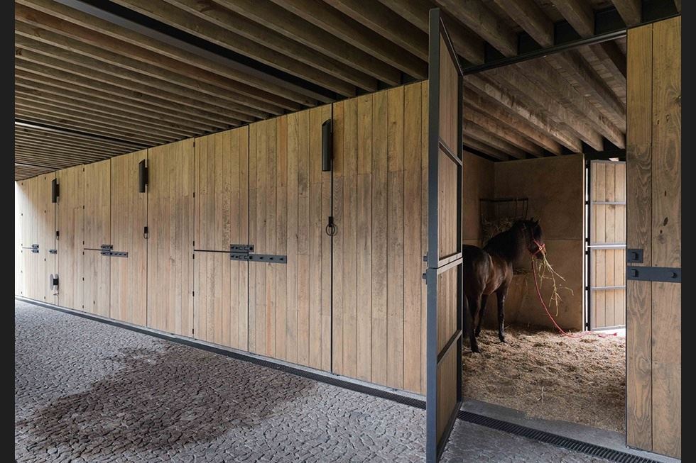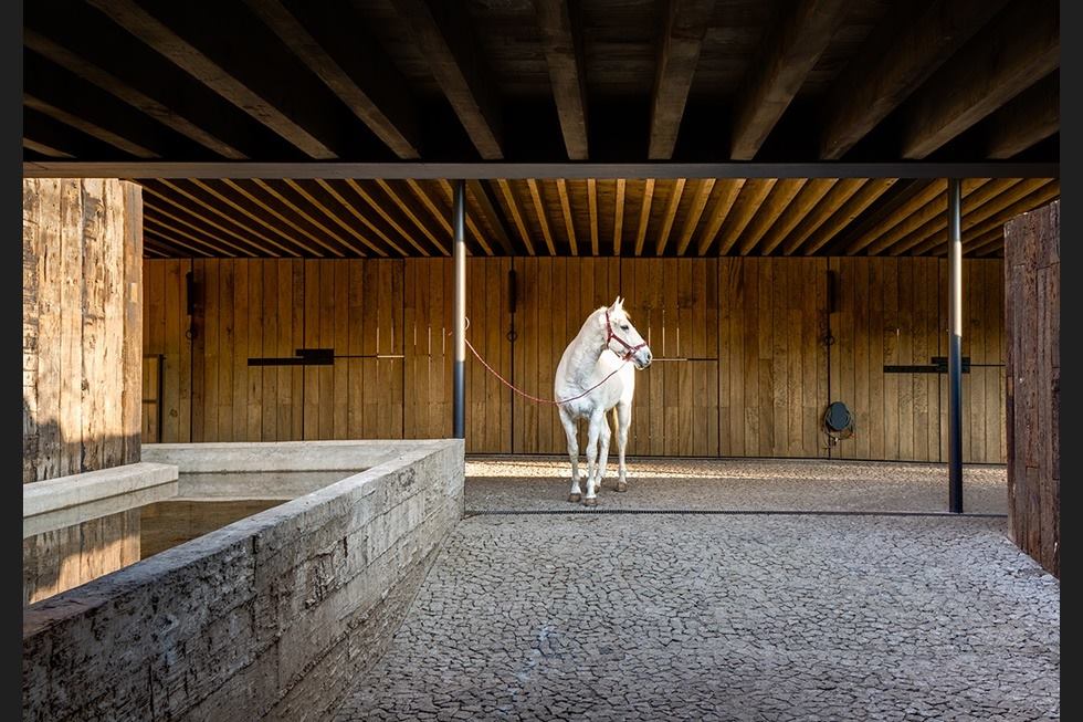 En las imágenes se pueden observar amplias instalaciones con terminados de madera y varios caballos, así como un lienzo.
