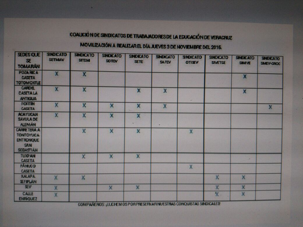 Ante la situación financiera del Gobierno del Estado, que ha ocasionado por enésima vez, el incumplimiento de pagos acordados con anterioridad, como el caso que nos ocupa, el RZ/2016, el Sindicato Independiente de Trabajadores de la Educación de México (Sitem) y la coalición de Sindicatos Magisteriales del Estado de Veracruz, les convoca a prepararse para la toma de casetas el día jueves en los siguientes puntos: