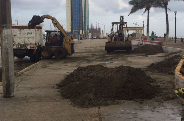 Este martes personal de Obras Públicas llevó a cabo el levantamiento de la arena en la calle, banqueta y arriate del Malecón, así como en la Ciclopista, para beneficio de los automovilistas, peatones y deportistas.