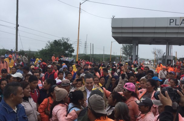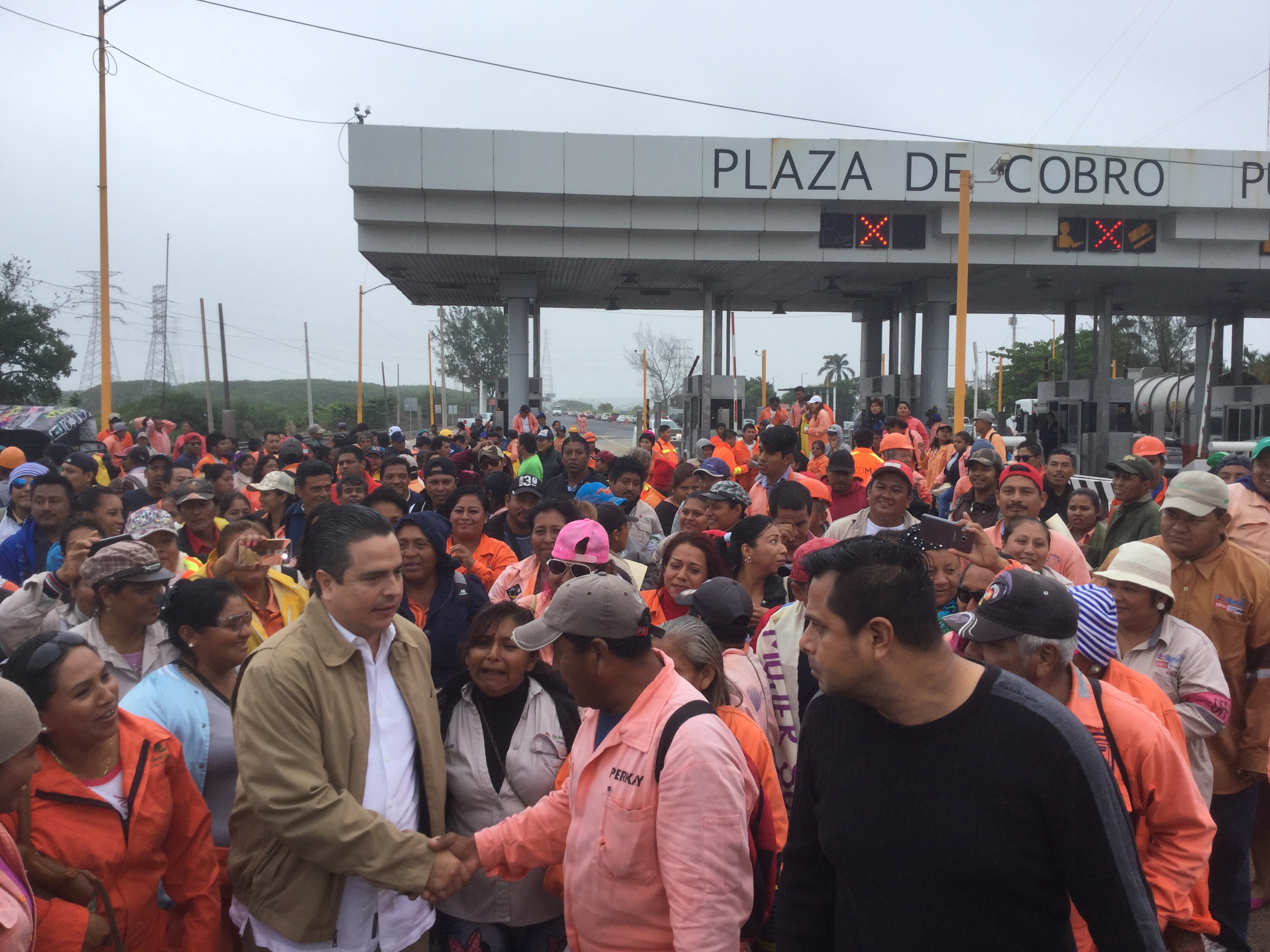 Dialoga Joaquín Caballero con los trabajadores que protestan en la caseta de cobro del puente