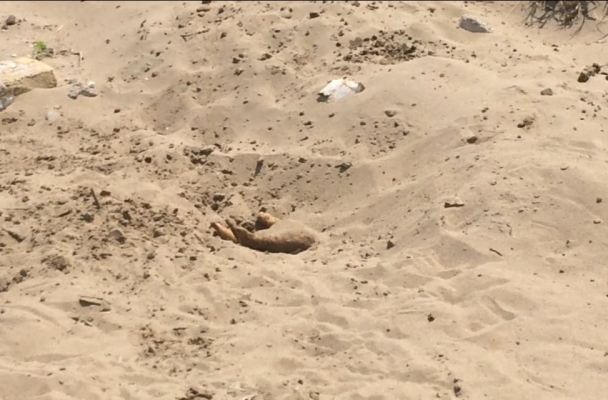 En la fosa clandestina se aprecia ver la mano de una persona, que es descubierta entre los médanos de arena.