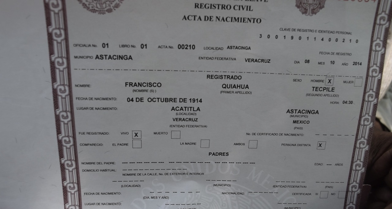 Fue personal del IVEA que llegó a las comunidades de Tierra Blanca quienes localizaron a don Francisco y lo invitaron a formar parte del grupo de estudios de adultos como parte del programa de alfabetización a nivel nacional para abatir el rezago educativo. Al momento de solicitarle sus documentos, descubrieron que su acta de nacimiento marca el 4 de Octubre de 1914 y este año cumple los 103 de vida.