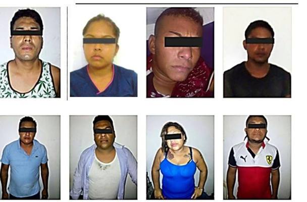 Luego de la detención de Zeferino “N”, de 30 años de edad, de ocupación albañil; Roxana Abigail “N”, de 31 años, comerciante; Lizbeth Vanesa “N”, de 24 años, comerciante; Julio César “N”, de 27 años, comerciante; José Alberto “N”, de 30 años, albañil; Guillermo “N”, de 31 años, taxista; Ernesto “N”, de 21 años, obrero y Alberto “N”, de 28 años, de ocupación obrero y de una menor de 17 años de edad, fueron puestos a disposición de la Fiscalía adscrita a la Unidad Integral de Procuración de Justicia (UIPJ).