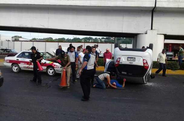 Dos personas resultaron lesionadas tras la volcadura de un vehículo en la carretera Transístmica, frente a la colonia Primero de Mayo en Coatzacoalcos.