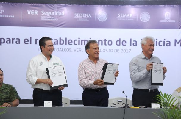 Coatzacoalcos, Ver., 28 de agosto de 2017.- El gobernador del estado, Miguel Ángel Yunes Linares, el alcalde, Joaquín Caballero Rosiñol, y el Secretario de Seguridad Pública, Jaime Ignacio Téllez Marie, firmaron el convenio de coordinación de acciones para el restablecimiento de la Policía Municipal, -el primero a nivel estatal-.