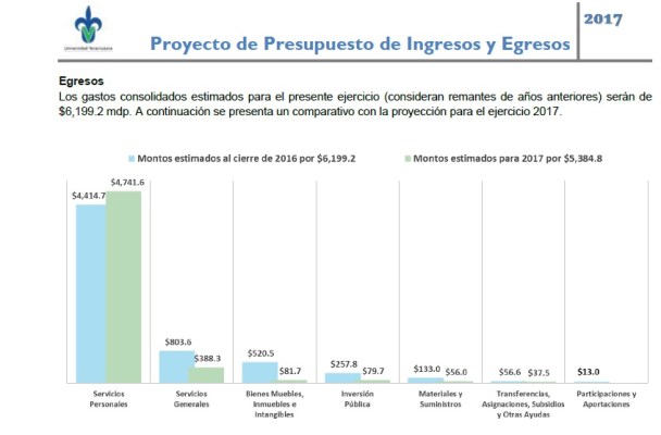 A través de un documento los estudiantes puntearon que cerca del 90 por ciento del presupuesto de esta institución se destina al pago de salarios. “El presupuesto anual establece que 4 mil 741 millones 600 mil pesos de los 5 mil 348 millones 800 mil pesos que ejerce la Universidad serán utilizados para el pago de servicios personales, o nómina”.