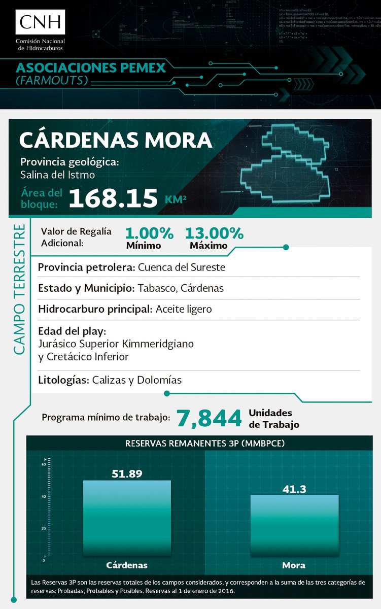 El bloque Cárdenas-Mora abarca una superficie de 168 km2 y se ubica aproximadamente a 62 km de Villahermosa, Tabasco. Cuenta con reservas probadas (1P) por 93 millones de barriles de petróleo crudo equivalente (MMbpce) ligero de alta calidad (39°API).