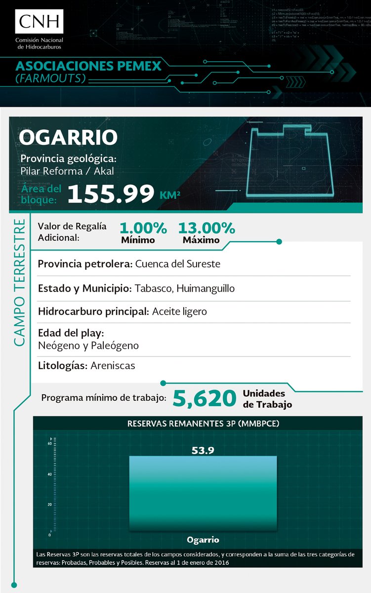 La empresa alemana DEA Deutsche resultó ganadora de la licitación del campo Ogarrio al ofertar un pago inicial de 190 millones de dólares, con lo que se reconocen las inversiones ya realizadas por Pemex, así como una regalía adicional de 13% y un pago en efectivo de 213.9 mmdd, que es el bono a la firma más alto ofertado en la licitaciones de la CNH, con lo que se garantiza que el Estado Mexicano capture el valor de la renta petrolera.