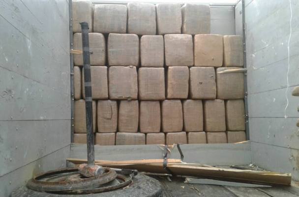 En atención a una denuncia ciudadana aseguraron a dos personas una de ellas del sexo femenino, quienes se trasladaban abordo de una camioneta de redilas de tres toneladas y media, que en un doble fondo transportaba 38 paquetes de marihuana con un peso aproximado de 731 kilogramos.