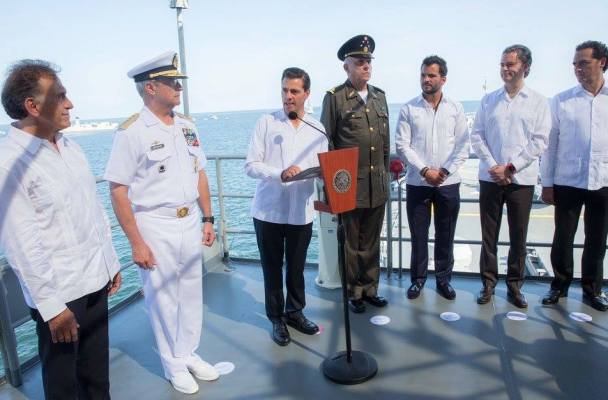 Al encabezar la ceremonia de hundimiento del casco del exbuque destructor ARM “Comodoro Manuel Azueta” D-111, acompañado por los secretarios de la Defensa Nacional, Salvador Cienfuegos, y de Marina, Vidal Francisco Soberón, indicó que las policías Militar y Naval «seguirán teniendo tareas para la seguridad de los veracruzanos”.