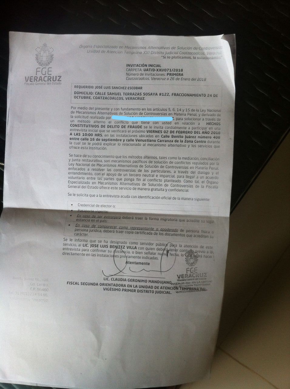 La FGE integró la carpeta UAT/d-xxi/071/2018 por hechos constitutivos de fraude, por parte de la fiscal segunda orientadora de la Unidad de Atención Temprana del delito, del vigesimo primer distrito judicial.