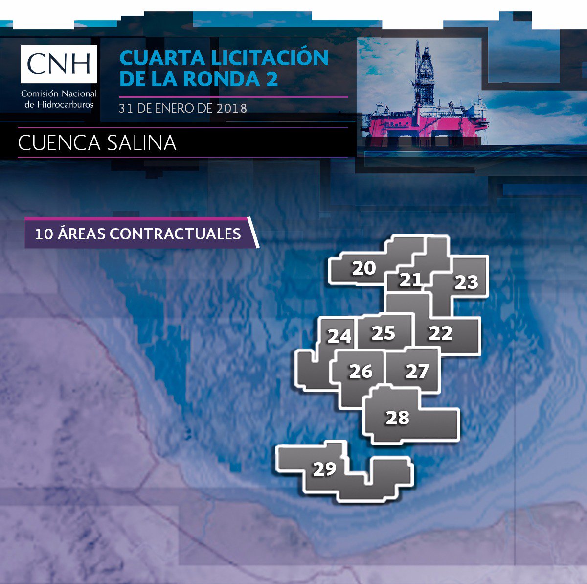Las 29 áreas contractuales que se licitarán se localizan en las regiones conocidas como Perdido, nueve áreas contractuales localizadas frente al litoral de Tamaulipas; Cordilleras Mexicanas, donde 10 se localizan frente al litoral de Veracruz y Cuenca Salina con 10 frente a Tabasco, con una superficie promedio de dos mil 290 kilómetros cuadrados.