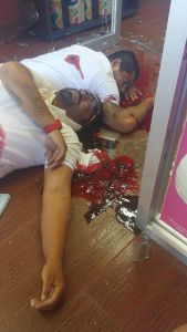 El cuerpo del hoy extinto terminó tendido boca arriba y con los brazos abiertos, en el quisio de la entrada de la negociación denominada Pastelería Suspiros.