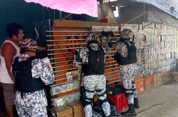 Este operativo sin precedente en la zona sur, se realizó la tarde de este domingo, al mismo tiempo en los cinco municipios en donde la Policía Naval realiza acciones de prevención del delito y seguridad pública municipal y tuvo como objetivo evitar la venta de discos de los conocidos como “pirata”, que dañan la legal propiedad del autor.