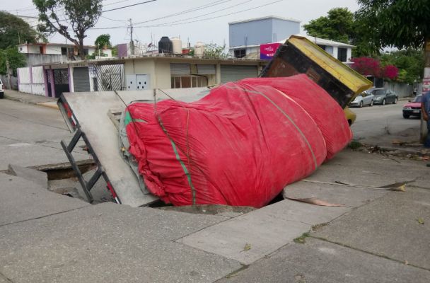 El socavón de más de tres metros de diámetro ocurrió en la calle Román Marín caai eaquina Lucas Alamán, en Coatzacoalcos.