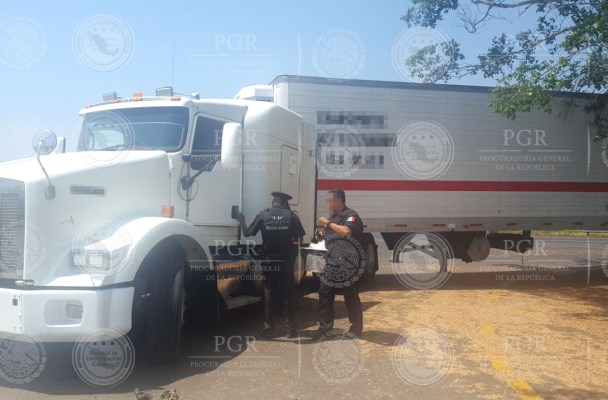 De acuerdo a la indagatoria, los agentes federales aseguraron al conductor de un tractocamión con semirremolque, tipo caja refrigerada, con placas de circulación de servicio de autotransporte federal, el cual se encontraba estacionado, aparentemente descompuesto.