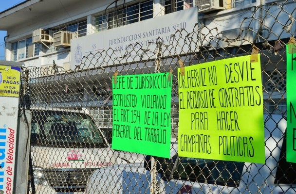Ciento cinco trabajadores de la sección nacional número 71, de la Secretaría de Salud de Veracruz de: Acayucan, San Andrés Tuxtla, Lerdo de Tejada, Isla, Catemaco, Ángel R. Cabada y Santiago Tuxtla, se fueron a paro de brazos caídos en la jurisdicción sanitaria diez, por la presunta negación de contratos a los integrantes de este equipo laboral.