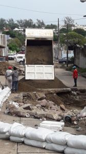 Personal de maquinaria pesada y Servicios Municipales, con el apoyo de 13 un camiones de volteo y una retro excavadora, comenzaron a rellenar el hueco que se produjo tras las lluvias de los últimos días.