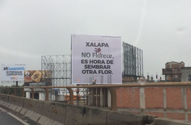 «Xalapa no florece. Es hora de sembrar otra flor» se lee en las lonas con las que se «tapizó» a la capital veracruzana.