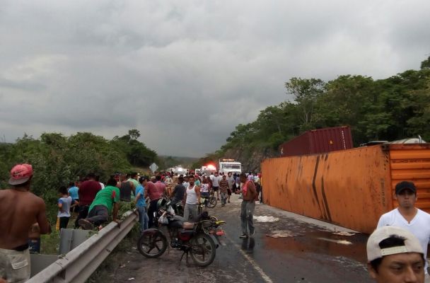 Un cargamento de despensa de apoyo para el país de Venezuela que era transportado en dos contenedores, fue robado por un grupo de personas luego de que el tractocamión que los remolcara, se volcó durante la tarde de este domingo a la altura del kilómetro 17 de la autopista Córdoba – Veracruz.