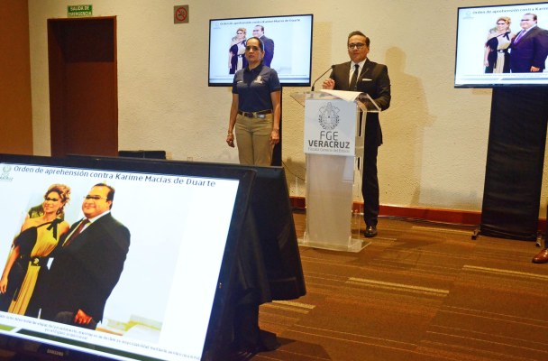 El Fiscal General del Estado Jorge Winckler Ortiz, en rueda de prensa anunció que se ha girado orden de aprehensión contra la ex presidenta del DIF estatal y ex primera dama de Veracruz, Karime Macías Tubilla, señalada por el gobierno del panista Miguel Ángel Yunes Linares de haber desviado presuntamente 112 millones de pesos. Foto: Agencia EL UNIVERSAL/RCC