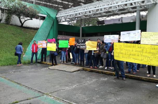 Profesores de distintos municipios se manifestaron ayer en la Secretaría de Educación de Veracruz (SEV), para reclamar que ya no se apliquen los descuentos a los salarios por supuestos préstamos.