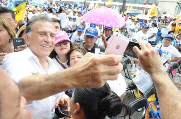 Yunes Linares se pasea por el malecón veracruzano, tomándose fotografías con los militantes de los partidos que postulan a su hijo para sucederlo en el cargo: PAN, PRD y MC.
