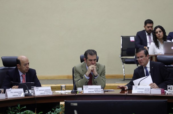 El consejero Enrique Andrade, Edmundo Jacobo Molina, secretario ejecutivo; y Lorenzo Córdova (centro), consejero presidente del Instituto Nacional Electoral, en sesión extraordinaria en donde se informa que concluye su participación en la elección Presidencial y da paso a la instalación de los Consejos Locales para efectuar el cómputo de cada entidad federativa.