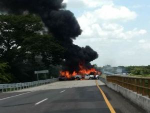 Se dijo que la pipa impactó a siete vehículos que colisionaron entre sí a lo ancho de toda la carretera, en tanto el combustible comenzó a regarse de manera descontrolada al momento.