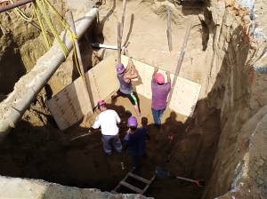 Para solucionar el problema, personal del gobierno local, con el apoyo de retro excavadora extrajó arena a una profundidad de unos cuatro metros, hasta encontrar la tubería de aguas negras dañada.