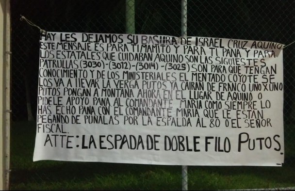 Este lunes, fue encontrada una manta que contenía un mensaje intimidatorio destinado a las diferentes corporaciones de las fuerzas del orden público, la cual estaba firmada por miembros del crimen organizado.