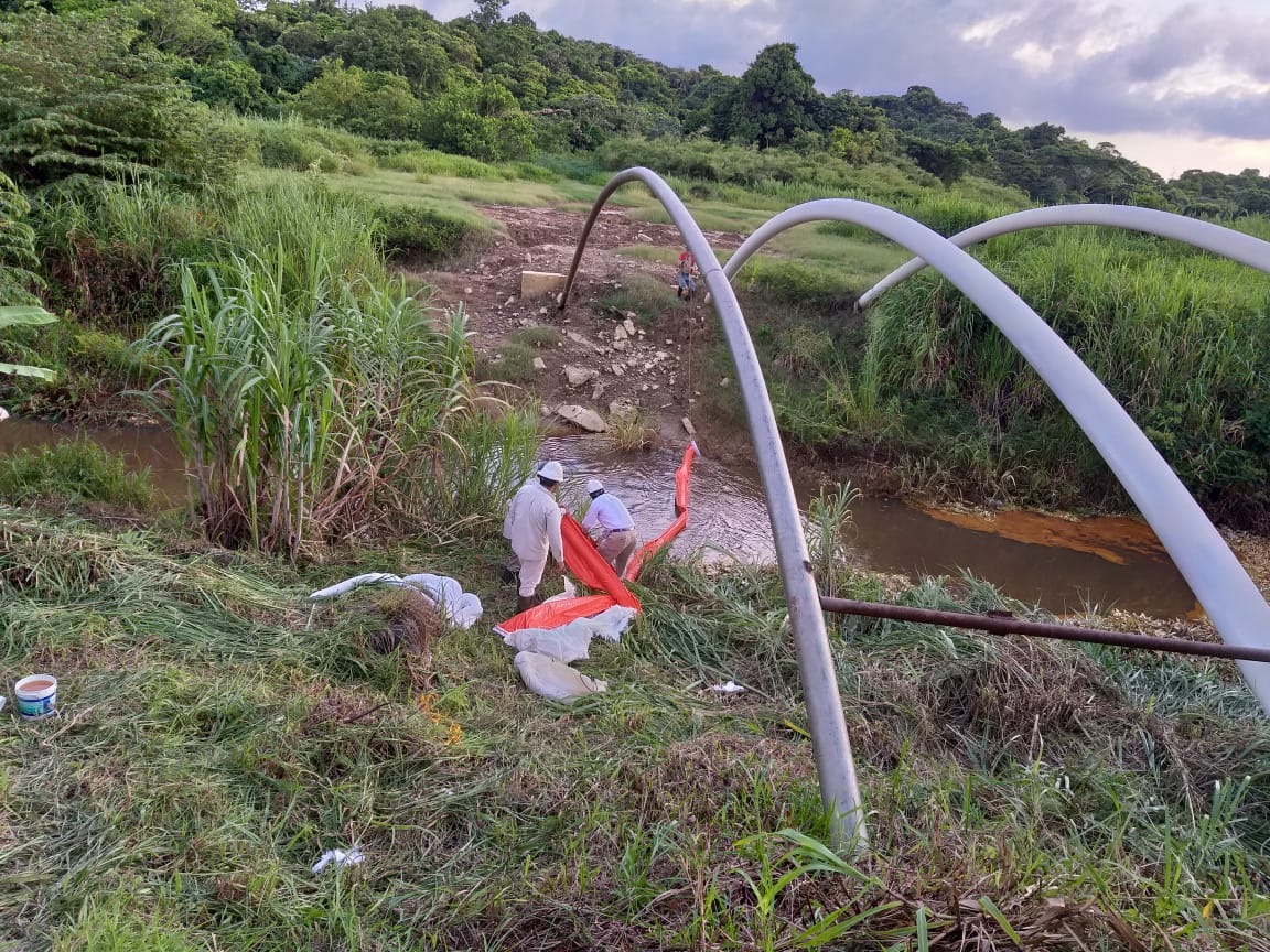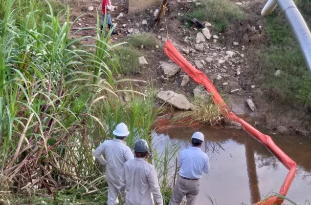 Derivado de las condiciones de la zona, afectada por las lluvias y la cercanía del arroyo, se encuentran en el sitio de forma preventiva, elementos de Seguridad Física y de Protección Civil municipal, quienes han alertado a la población para que no se acerquen a la zona, con la finalidad de no interrumpir las labores del personal especialista, mientras se identifica el origen de salida del producto y posteriormente iniciar la reparación de la línea.
