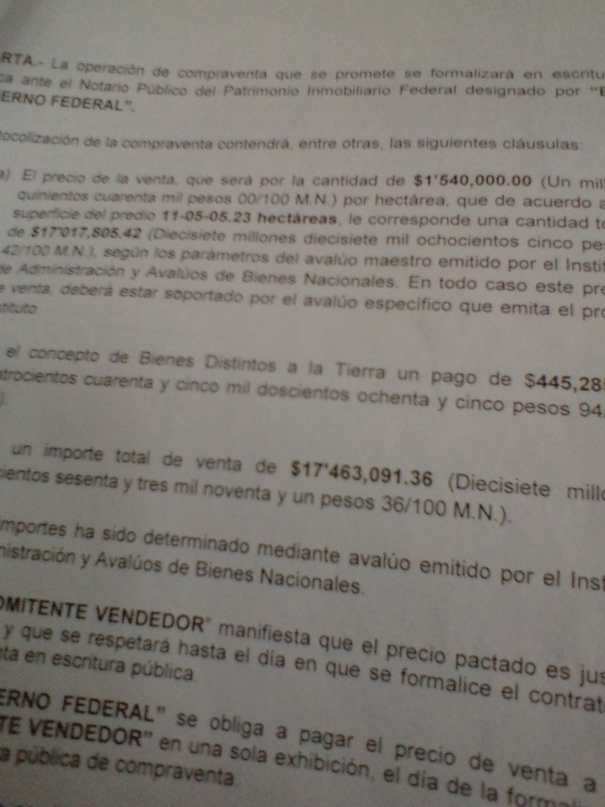 Fue el Gobierno Federal a través del Instituto de Administración y Avalúos de Bienes Nacionales de la Secretaría de la Función Pública, el que hizo las negociaciones para comprar los terrenos en el ejido 5 de mayo, con la representación de Luis Fernando Morales Núñez, quien es director general de Patrimonio Inmobiliario Federal de dicho Instituto.