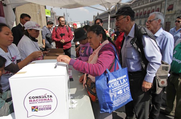 Aspectos de la consulta sobre el Nuevo Aeropuerto Internacional de México (NAIM), en la casilla instalada en el Zócalo de la Ciudad de México