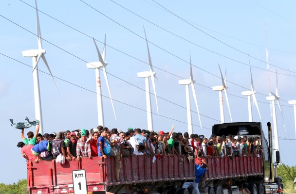 migrantes siguen a pie su trayecto, mientras pasan por los aerogeneradores del Parque Eólicos en el Istmo.