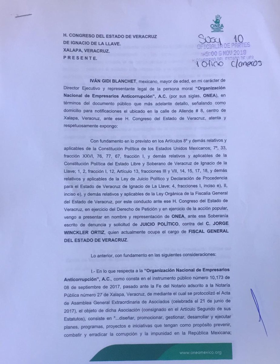 La Organización Nacional Anticorrupción (ONEA) presentó una solicitud de Juicio Político contra el actual Fiscal General del Estado de Veracruz, Jorge Winckler Ortiz, en voz de su Director Ejecutivo, Iván Gidi Blanchet, en el ejercicio de su derecho como ciudadano y representante legal de la ONEA, mismo que se indica en el Artículo 77 de la Constitución Política del Estado Libre y Soberano de Veracruz, que dicta que: