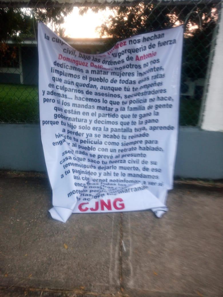 En ambas lonas, de color blanco con letras rojas, se refiere un mensaje que el cartel de Jalisco envió a Yunes Linares sobre el asesinato de la hija de la diputada Carmen Medel, del que se deslinda de dicho acto.