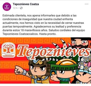 «Estimada clientela, nos apena informarles que debido a las condiciones de inseguridad que nuestra ciudad enfrenta actualmente, nos hemos visto en la necesidad de cerrar nuestras puertas temporalmente. Agradecemos su lealtad y preferencia durante estos 18 maravillosos años. Saludos cordiales del equipo Tepoznieves Coatzacoalcos. Hasta pronto».