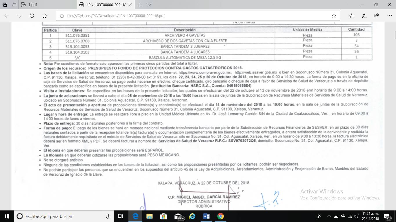 De acuerdo con la licitación LPN-103T00000-022-18, la Secretaría de Salud convocó a los interesados en adquirir 103 archiveros de 4 gavetas; 3 archiveros de dos gavetas con caja fuerte; 54 banca tándem de 3 lugares; 56 bancadas tándem de 4 lugares y una báscula automática de mesa de 12.5 kilógramos.