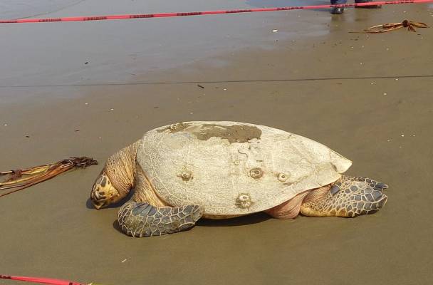 La tortuga que medía más de un metro, presentaba rastros de sangre y tenía varios días de fallecido, de acuerdo al ambientalista