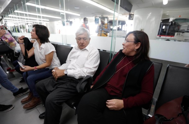 El Presidente de la República, Andrés Manuel López Obrador, en el aeropuerto de la Ciudad de México para tomar su primer vuelo comercial a Veracruz ya como mandatario. Lo acompaña Rocío Nahle, secretaria de Energía.
