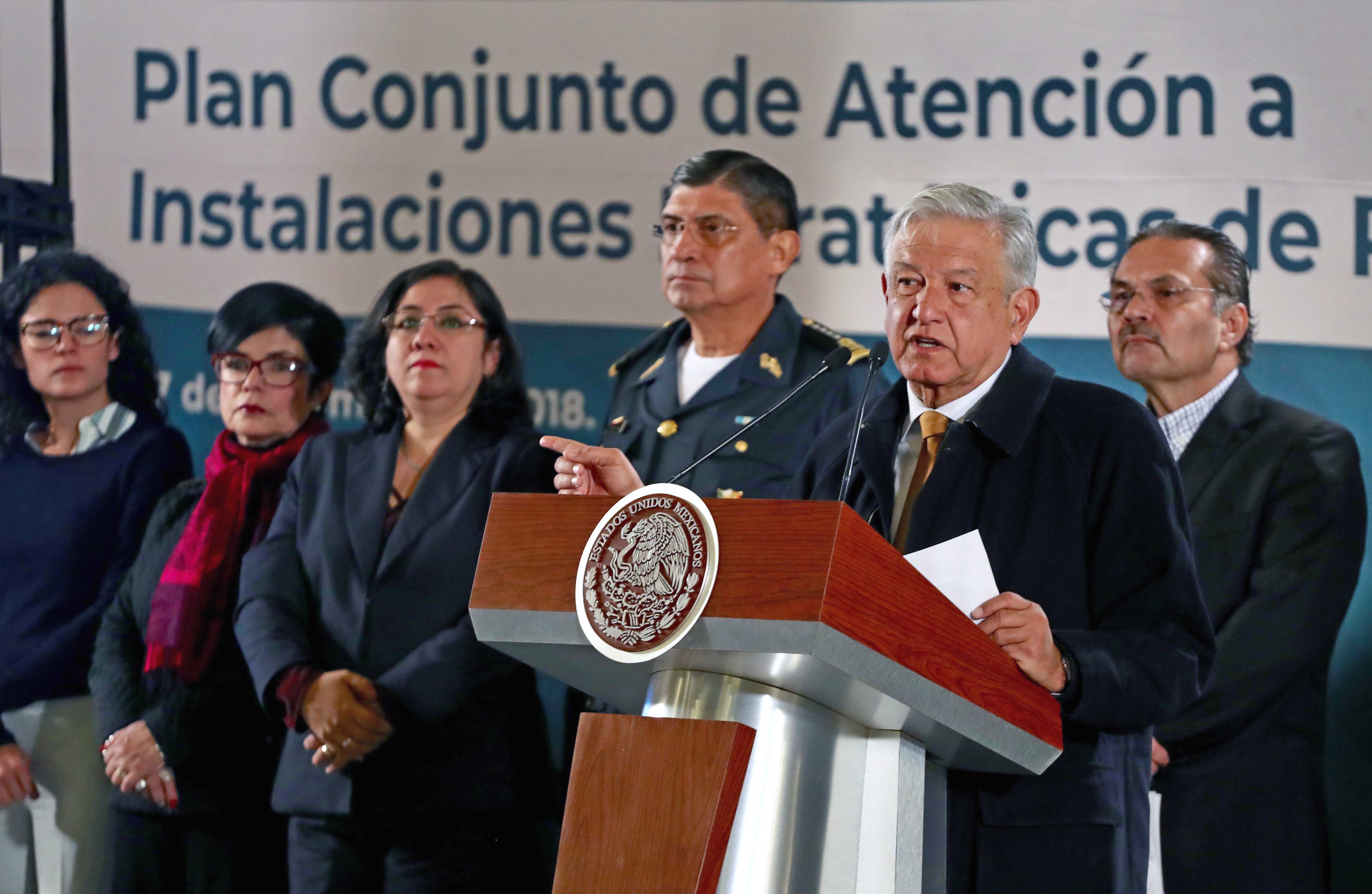 EUM20181227NAC03.JPG CIUDAD DE MÉXICO. Presidency/Presidencia-AMLO. 27 de diciembre de 2018. El presidente Andrés Manuel López Obrador (centro) durante conferencia en Palacio Nacional presenta el plan contra el robo de hidrocarburos. Lo acompañan Octavio Romero Oropeza, director de Pemex; el general Luis Crescencio Sandoval, titular de la Sedena, Olga Sánchez Cordero, secretaria de Gobernación; y Alfonso Durazo, secretario de Seguridad. Foto: Agencia EL UNIVERSAL/Berenice Fregoso/EELG